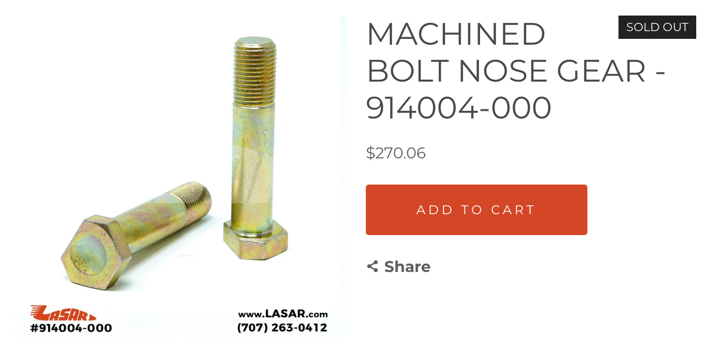 What we (might) have here is a failure to communicate. Or something like that. The bolt through the collar that retains the shock discs is a standard AN5-16A (AN5-15A in my early IPC). Less than a dollar ea. on Spruce, and $1.08 from LASAR. However, the bolt at the bottom of the shock link is an AN7-22A, $3.60 from Spruce. BUT, this bolt has a shaved head so it can be installed past the ears on the spindle assy… which you won’t find for sale on Spruce. LASAR sells this bolt for $270.06 (almost $300). I guess you could take the Spruce bolt to the bench grinder, but it won’t be nearly as pretty as the Mooney version. A machine shop could probably shave the head of a Spruce bolt and re-cad plate it so it looks pretty, but I’m not sure what they might charge for that service.- 1 reply